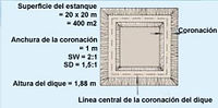 Con una anchura de coronación de 1 m, el volumen de los diques sería entonces de 648 m³ x 1,25 = 810 m³.